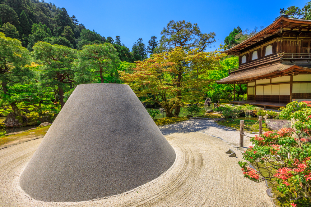 金閣寺と同様に将軍の要請で自身の別荘として15世紀に創建されたお寺で、金閣がその名の通り金箔に覆われている一方銀閣は銀箔には覆われておらず、落ち着いた詫び寂びを感じさせるような佇まいをしております。