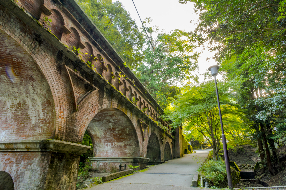 19世紀の終わり頃に建設された全長92mの水路閣はレンガ造りのアーチ型の橋脚が美しくその洋風建築と南禅寺の境内の自然が見事に調和しています。